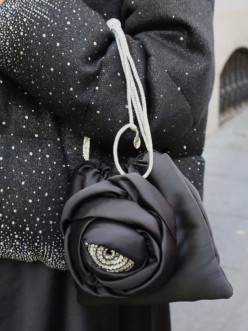 Bolso tipo saco de satén con flor de strass y doble asa.