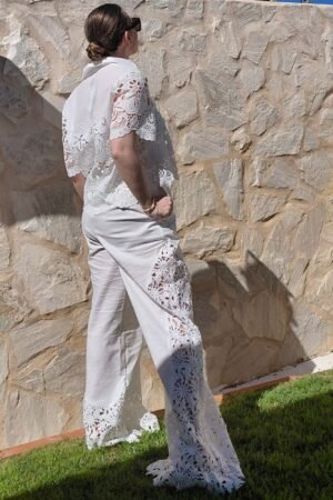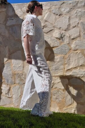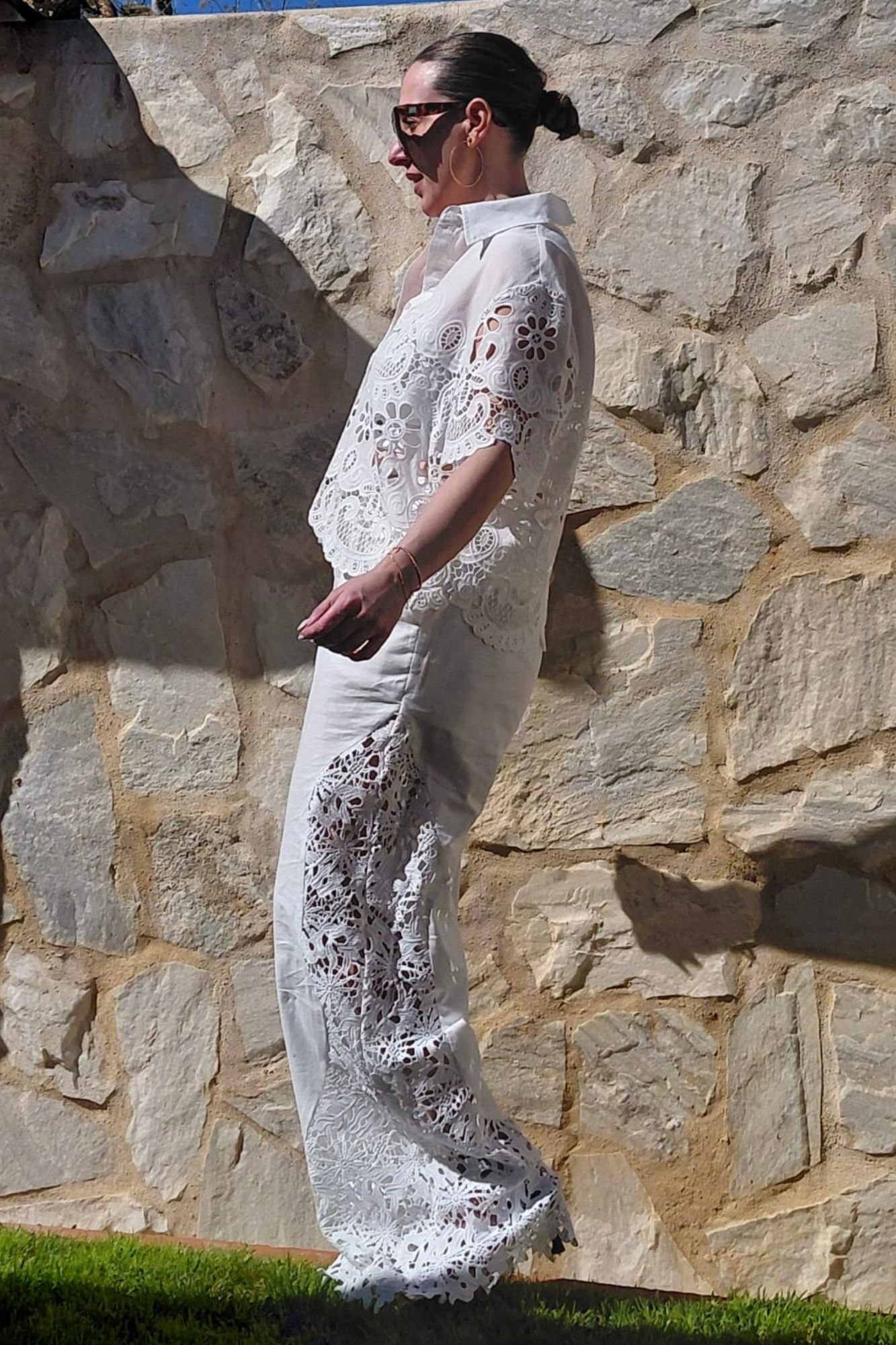 • Total look artesanal: Combínalo con nuestra camisa troquelada a juego para crear un conjunto monocromático de gran impacto visual. Es la opción ideal para un evento de día en un entorno mediterráneo o un paseo costero.