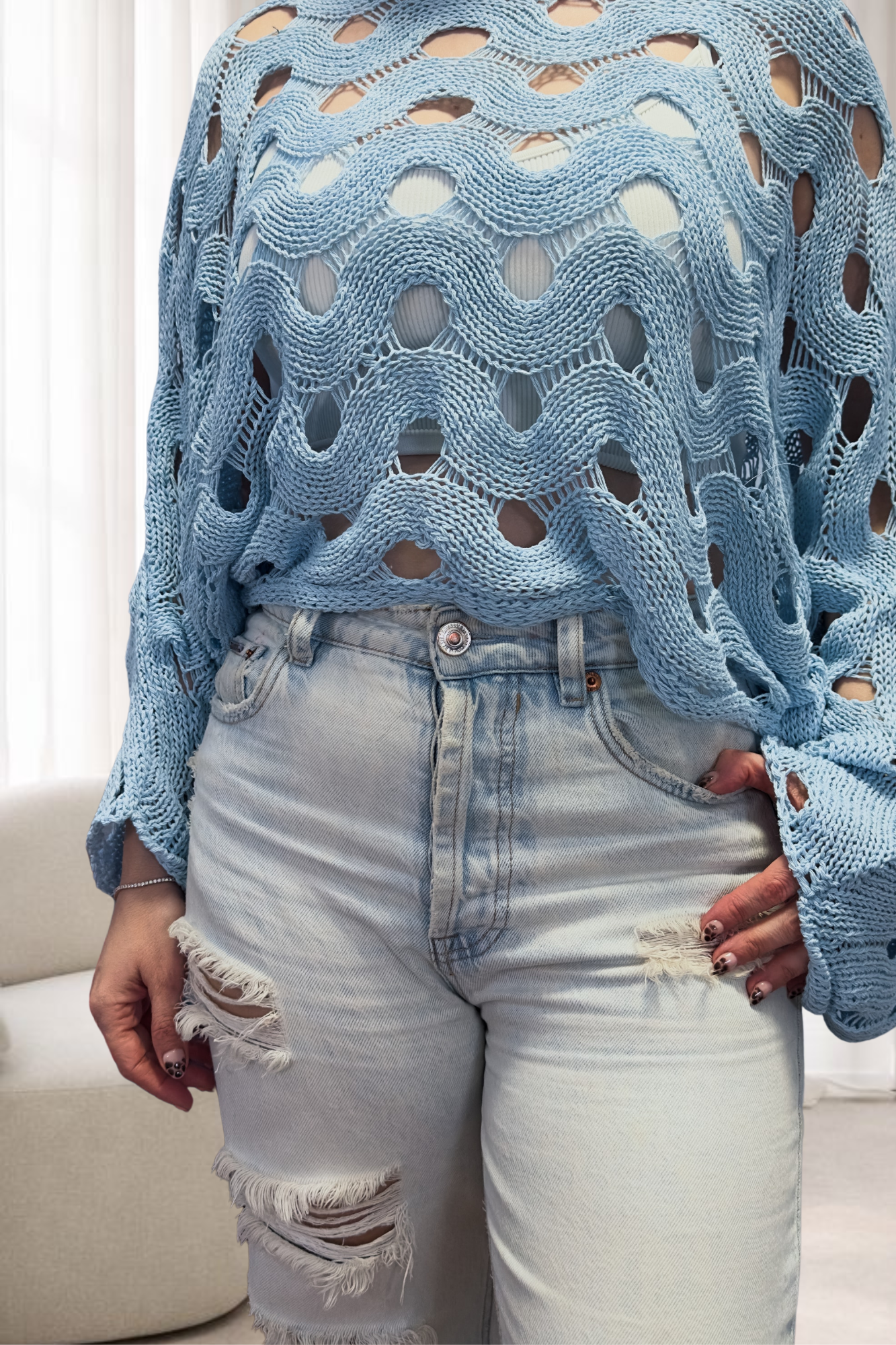 • Renueva tu fondo de armario con nuestro suéter de punto calado. Confeccionado en 100% algodón, ofrece un diseño artesanal y ligero en tonos azul, beige y blanco perlado.
