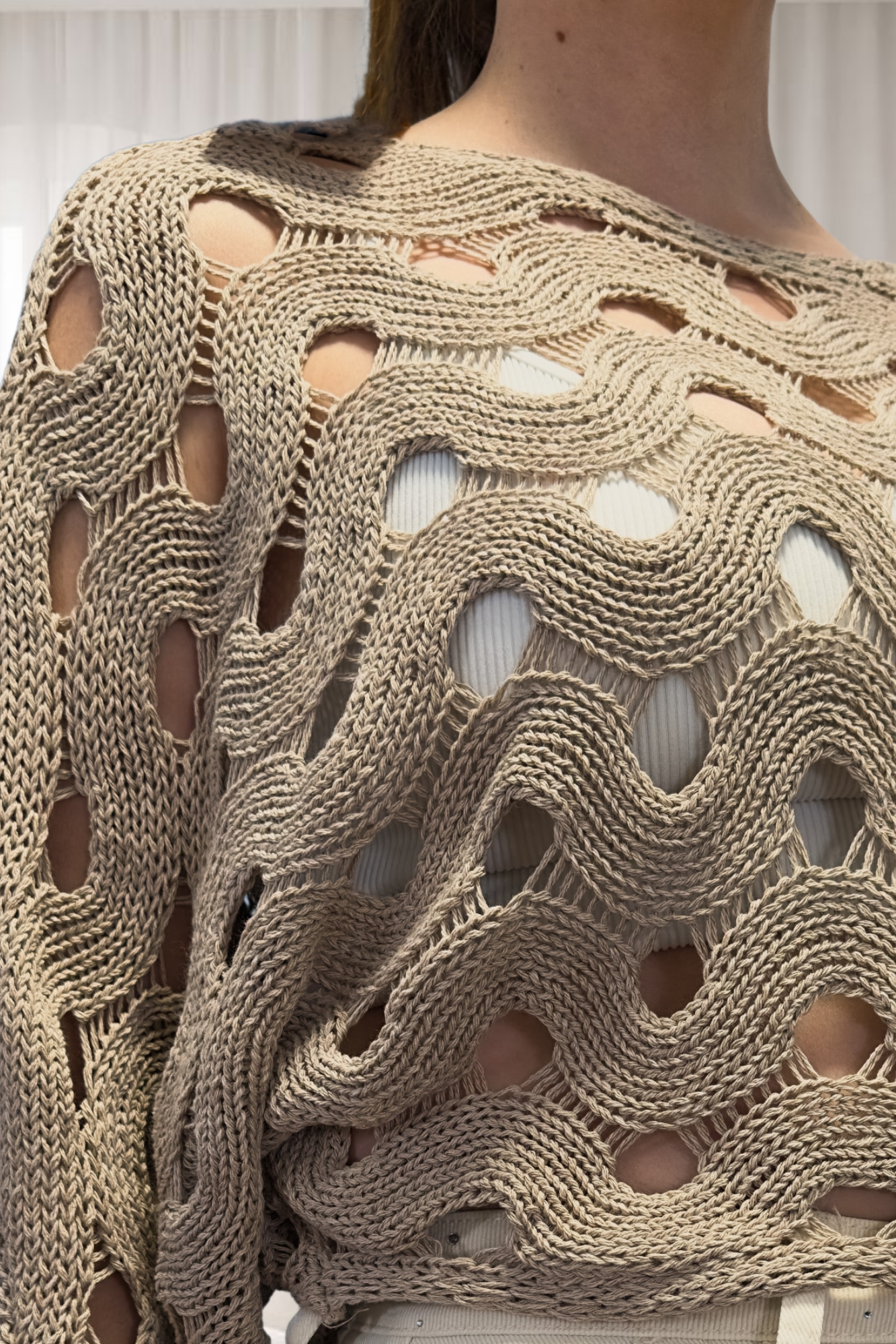 Este suéter de manga larga es una pieza clave de nuestra colección, destacando por su meticulosa construcción en 100% algodón. El diseño técnico se basa en un punto calado con un patrón de ondas sinuosas y aberturas circulares que permiten una transpirabilidad excepcional, ideal para las estaciones de transición. Su textura es suave al tacto y presenta una caída ligera que se adapta con naturalidad a la silueta. La calidad del hilo de algodón garantiza que la prenda mantenga su forma y frescura, consolidándose como una inversión duradera para un fondo de armario versátil y atemporal.