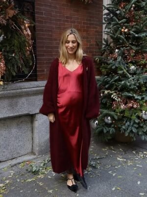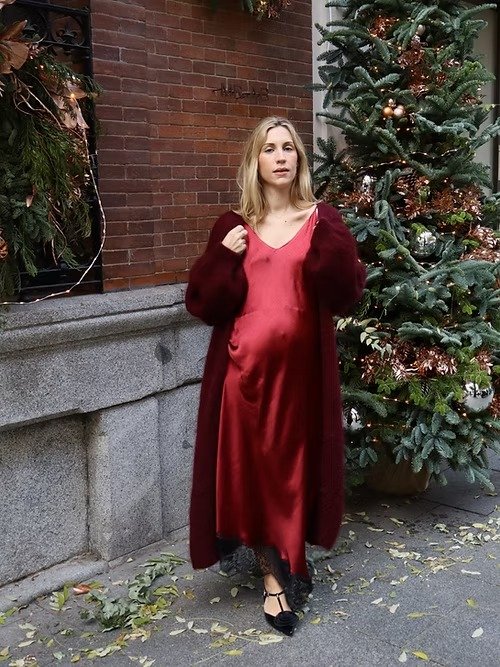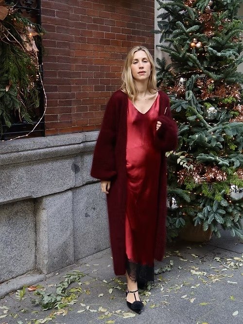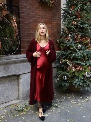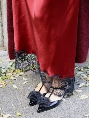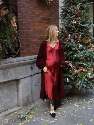Vestido lencero largo burdeos con encaje negro y broche de perlas.